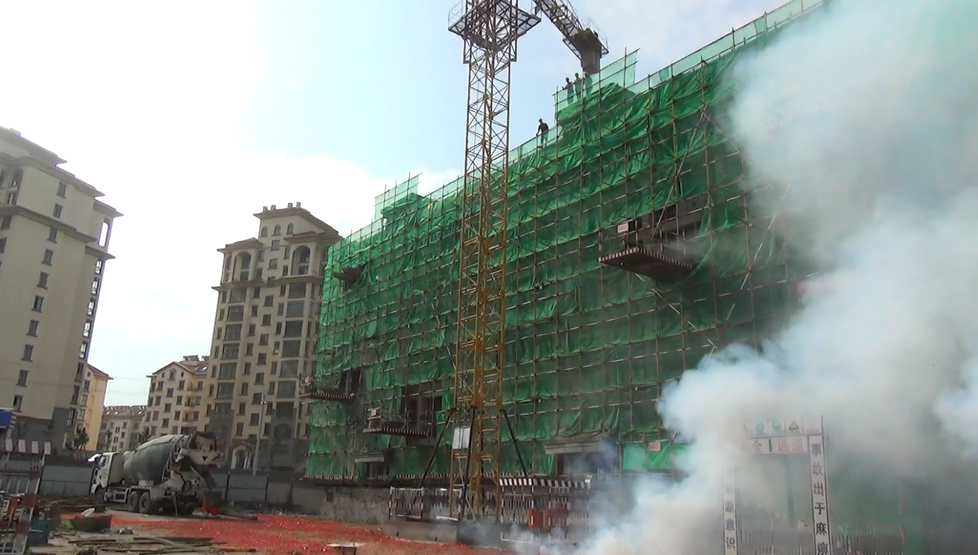在彩煙齊放、鞭炮喧天中封頂儀式禮成。